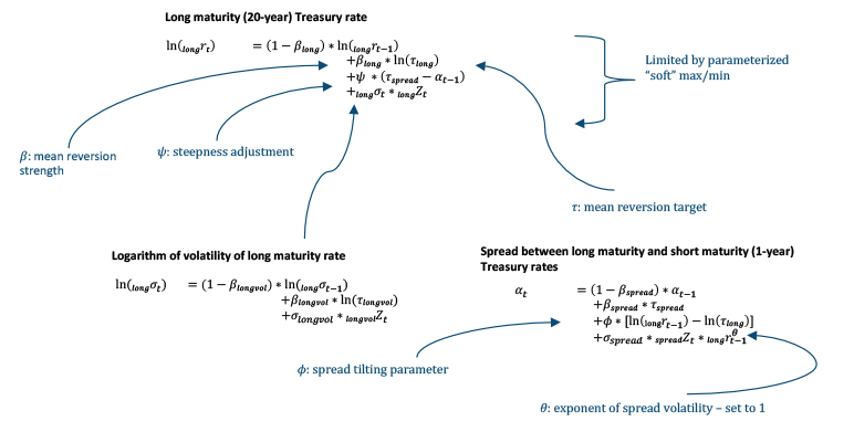 - Steepness (ψ) and spread tilting parameters (𝜙) are applied to the long rate and spread processes, respectively, to reduce the likelihood of unrealistic inversion events compared to historical data.