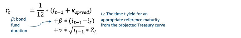 For each of the three bond funds, the mechanics (1) tie the fund return to the Treasury rate generated through the interest rate model at specific reference maturities, such as 10-years for the long duration corporate fund and (2) apply a spread adjustment appropriate for the riskiness of the underlying bonds. This enforces an internally consistent worldview between the interest rate process and the bond funds.