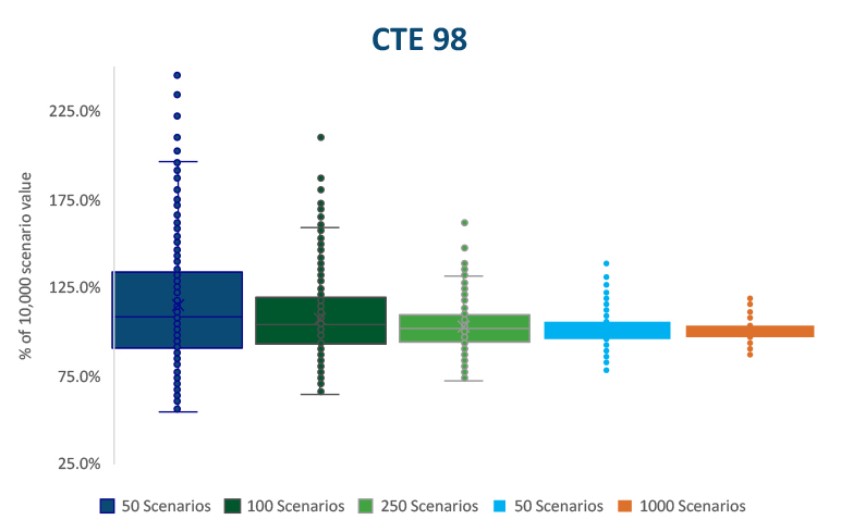 Consider the CTE figures for a sample GMAB valuation in Figure 9. When comparing against a 10,000-scenario benchmark, we see that the fewer scenarios we use, the less reliable our valuation, especially given the focus on extreme tail scenarios. Said differently, a 100-scenario result will only use two scenarios to inform CTE 98 valuation.