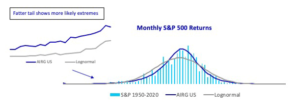 When comparing AIRG S&P 500 projections against a lognormal model parameterized to the same mean and volatility, the SLV has a tighter fit to the distribution of historic data. The AIRG exhibits some attractive qualities such as fatter tails and a skewed long left tail. Ultimately, the chosen parameters do rely on subjective judgement, such as evaluating historical interest rate patterns and defining a “reasonable” expectation of equity risk premium to set long-term return averages. The Academy periodically reviews the validity of underlying parameters.