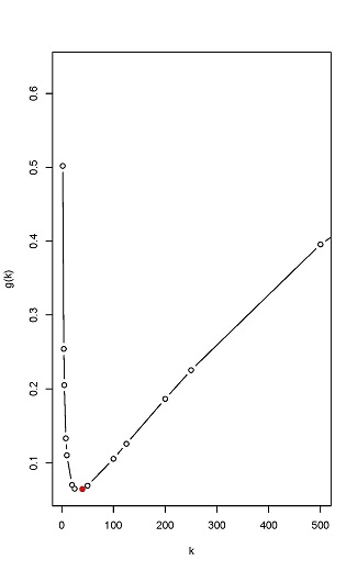 After calculation, the theoretically optimal k can be chosen as 100, and the corresponding g(k) = 0.02.