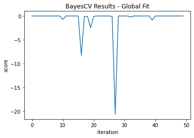 In a perfect world, we could somehow know the optimal parameters to compare with our work. Since this is not possible, I fit a “global” Bayesian grid search with 50 iterations. This will at least give an idea of the optimal parameters and score. By default, a random draw of acquisition functions will be used to pick the next point. We will then compare this with grid searches done for specific acquisition functions and parameters.