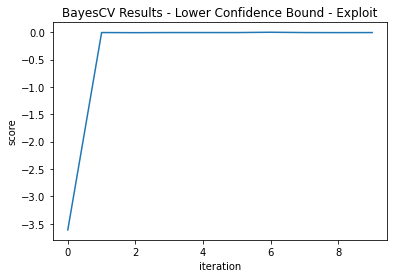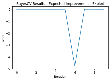 The exploitation version got lucky and found its optimal point on its first iteration. It was not so lucky in that it didn’t explore more and its best score was - 0.00682, not quite as good as the global search.
