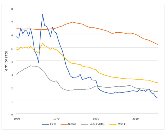 Global Fertility Rates (Births Per Woman) in Selected Countries Since 1950[9]