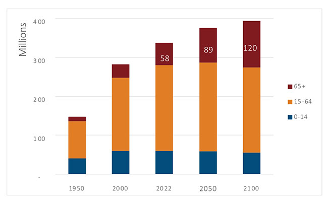 Of growing importance in many countries during this century is the old-age dependency ratio. Figure 4 breaks down total U.S. population by age group from 1950 with projections to 2100. The number of young and working age groups are predicted to be relatively stable over the period from now to 2100, but the 65+ group is projected to more than double in size. It is easy to see why social safety nets for the elderly will be an increasing drag on economic growth.