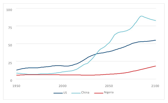Growing population levels, especially in the primary working ages of 15–64, generate GDP growth even when productivity is stagnant. China’s population, the largest for a country today, has already peaked. Nigeria is representative of countries with a rapidly growing population. The United States population is expected to continue to rise at a steady rate, but this growth is reliant on immigration.